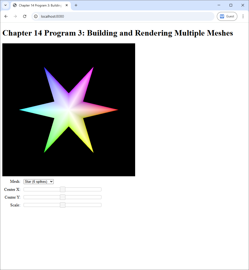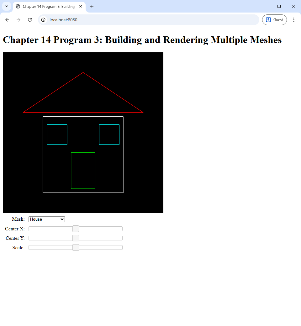 This chapter presents a way to solve the above programs by creating new abstractions (i.e., classes) for GLSL programs and colored meshes. These abstractions are what the author personally use in his personal projects, and they will be use in later chapters of the book. We choose to introduce them here because he thinks he would not be able to manage WebGL's complexity without them. A decent programmer must know the limit of their cognitive capacity and introduce appropriate abstractions to make their life easier.